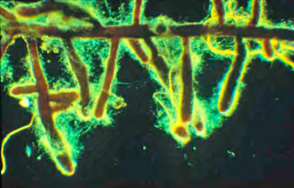 Mycélium (mycorhize) autour des poils radiculaires dans un sol sain - (Photo tirée de: « 120 Jahre E.coli - Bedeutung in Forschung und Medizin »)